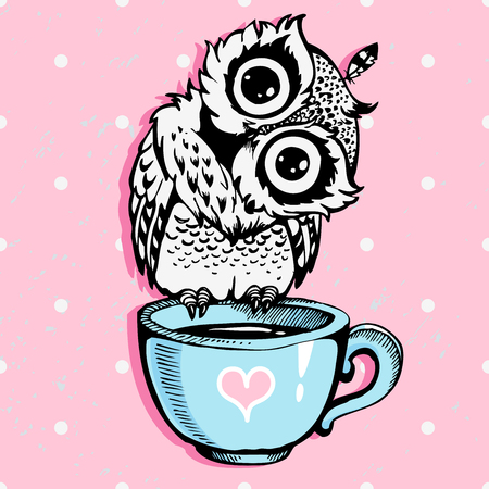 カップラインスケッチ手描きの漫画キャラクター付きかわいいフクロウ Tシャツプリントデザイン 塗り絵 挨拶 招待カード用ベクトルイラストのイラスト素材 ベクタ Image